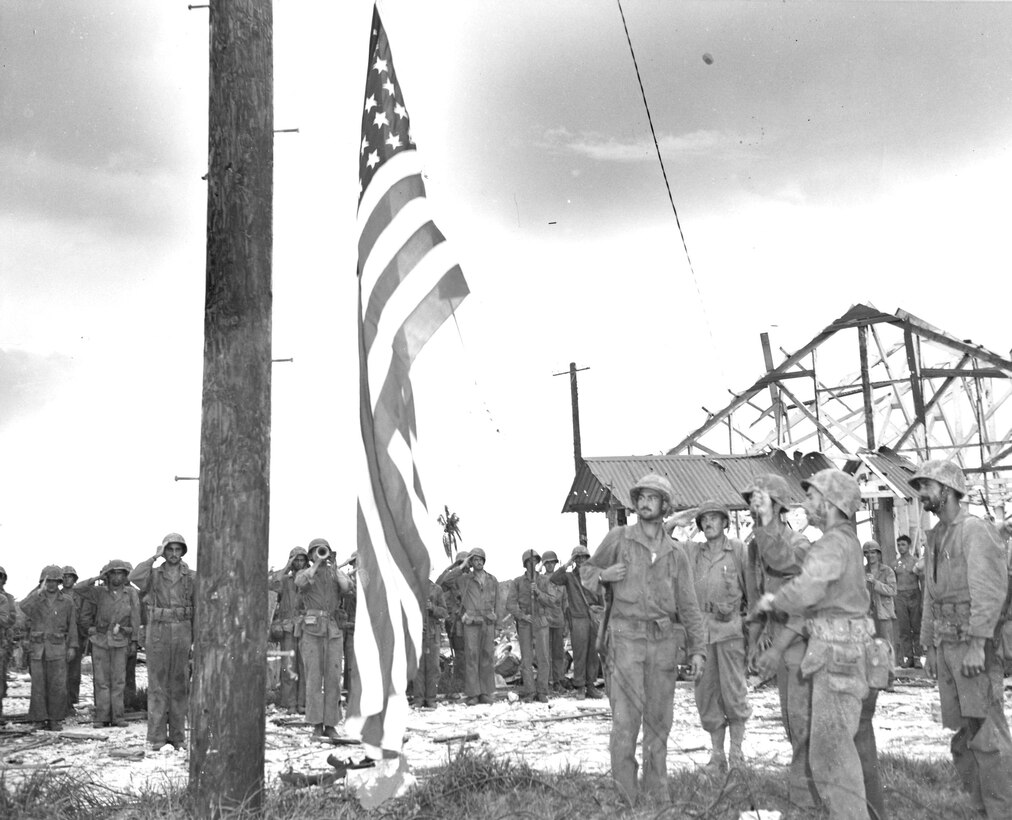 Marines raise Old Glory once again after more than two years the Marines raise the American Flag over the Marine barracks on the island of Guam. These same Marines seen in this picture took part in the recapture of the Marine barracks just a few hours before this picture was taken.